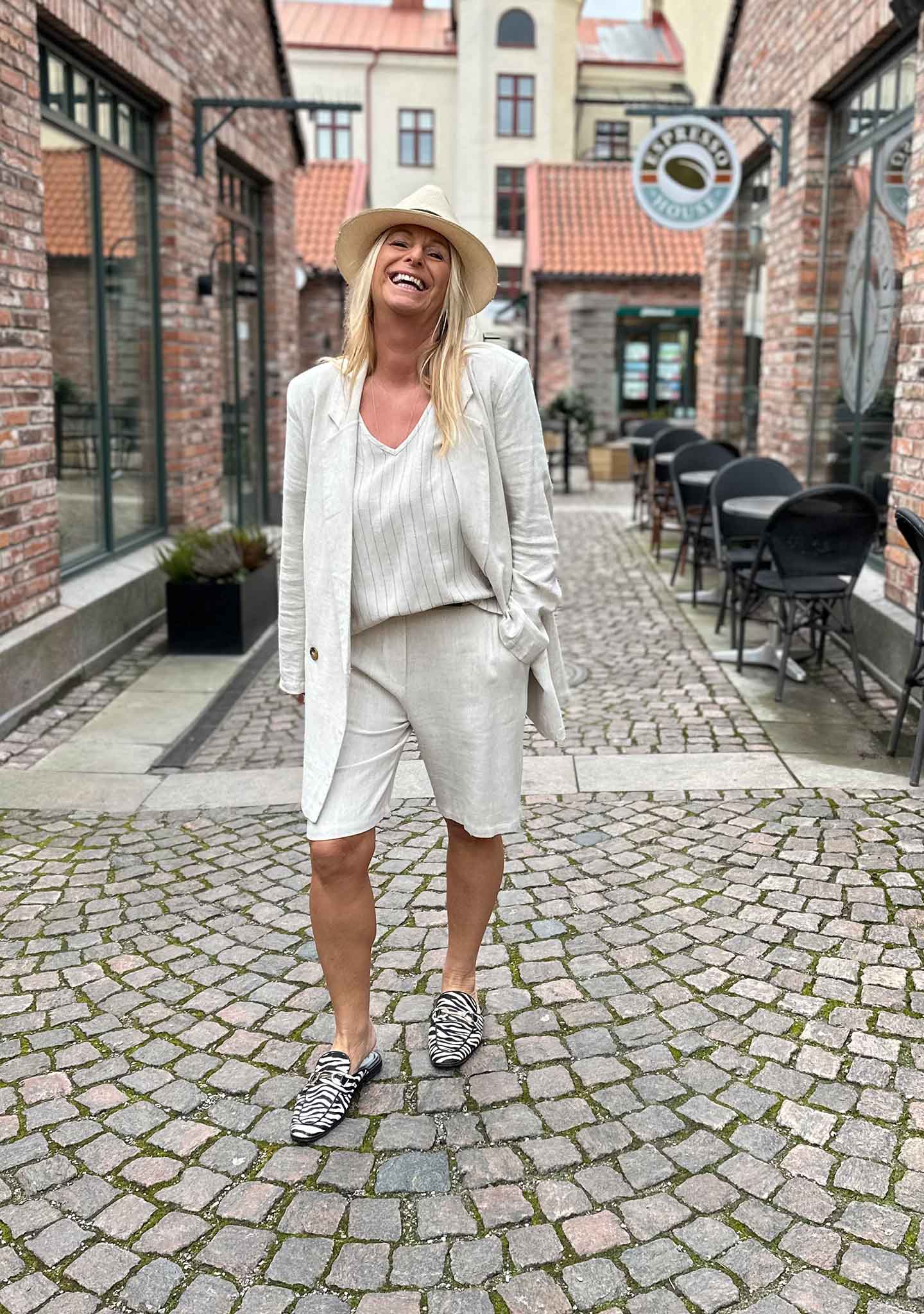 Schlüpfen Sie in die Saison mit unserem zeitlosen Pearl Blazer mit tiefem Schalkragen und Knopfverschluss. Die übergroße Passform kombiniert Komfort und Eleganz perfekt. Der Blazer hat lange Ärmel und eine Länge, die bis zum mittleren Oberschenkel reicht. Kreieren Sie einen entspannten Look, indem Sie den Leinenblazer über ein Kleid tragen und mit einem Paar Loafers ergänzen.