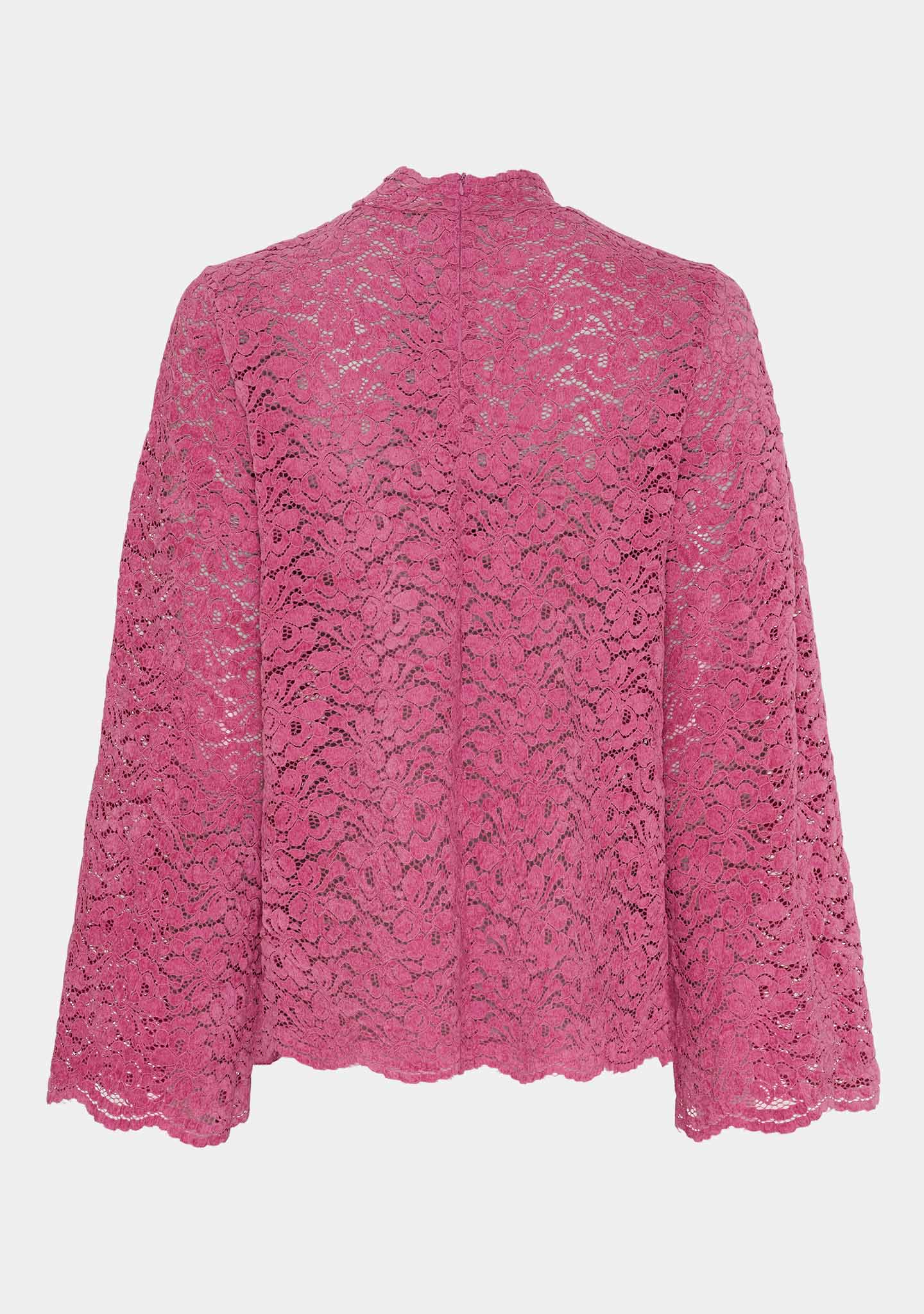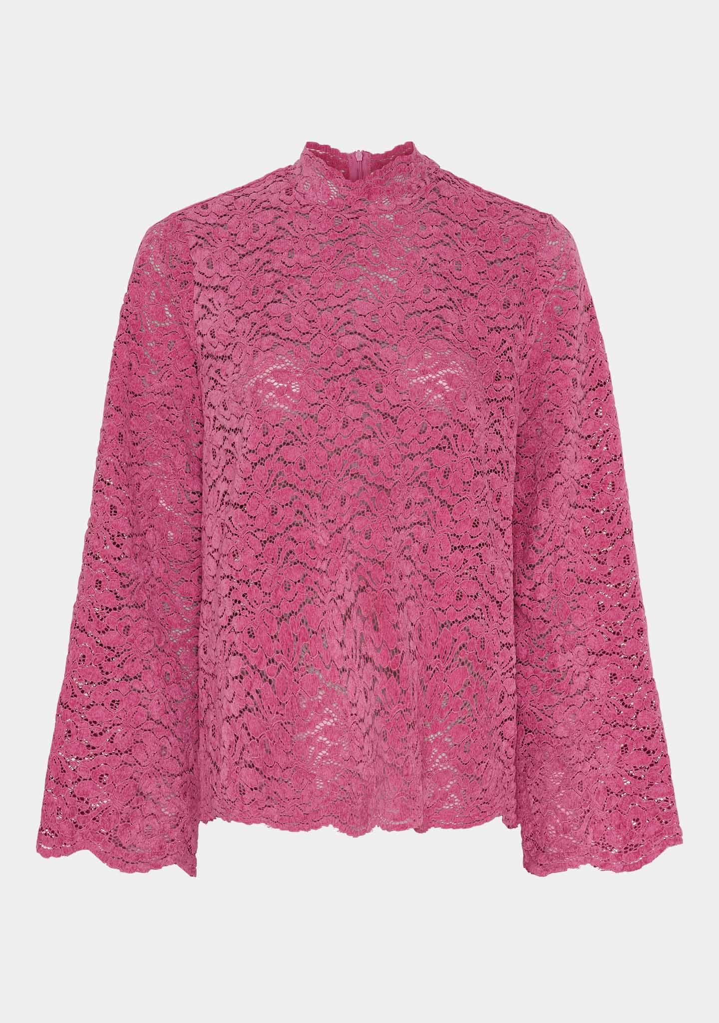 Kamille Lace Blouse ist eine schöne und feminine Spitzenbluse mit einem exklusiven Ausdruck. Der hohe Kragen und die langen Ärmel mit gewelltem Rand schaffen ein stilvolles Design, das den eleganten Look der Bluse betont