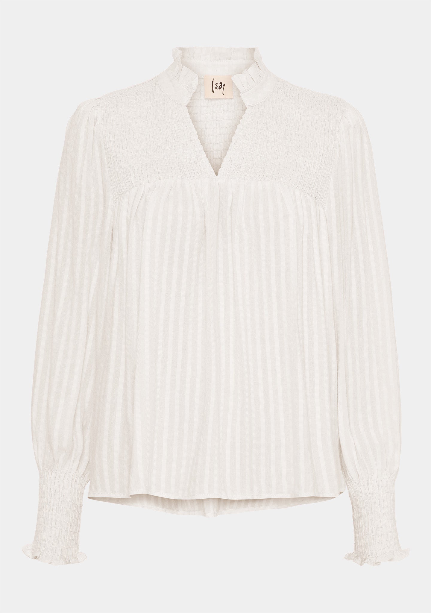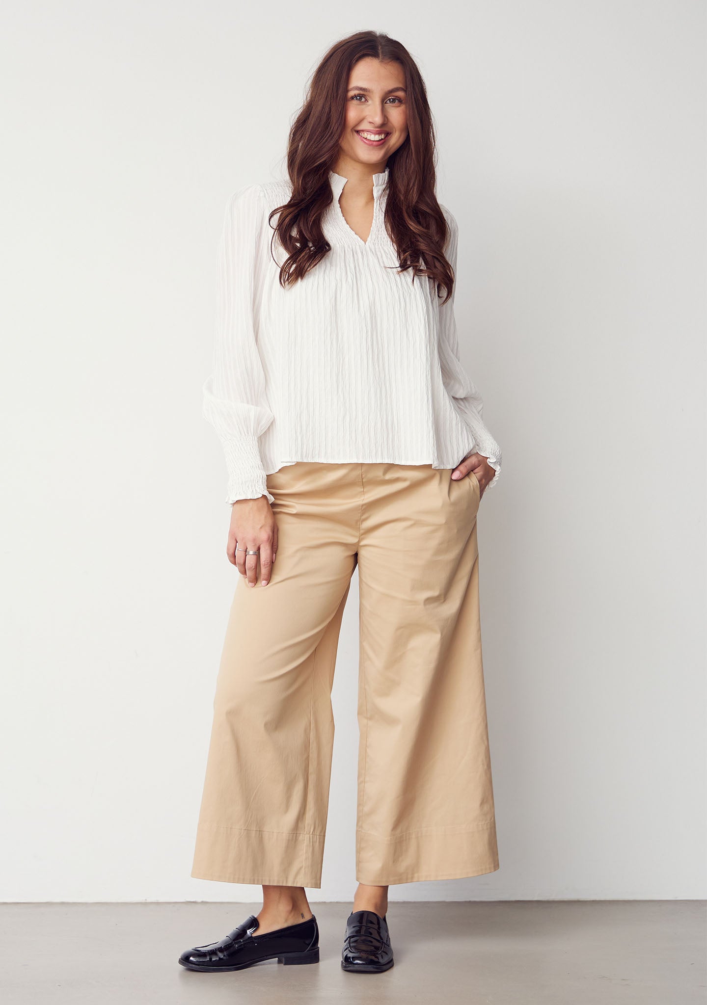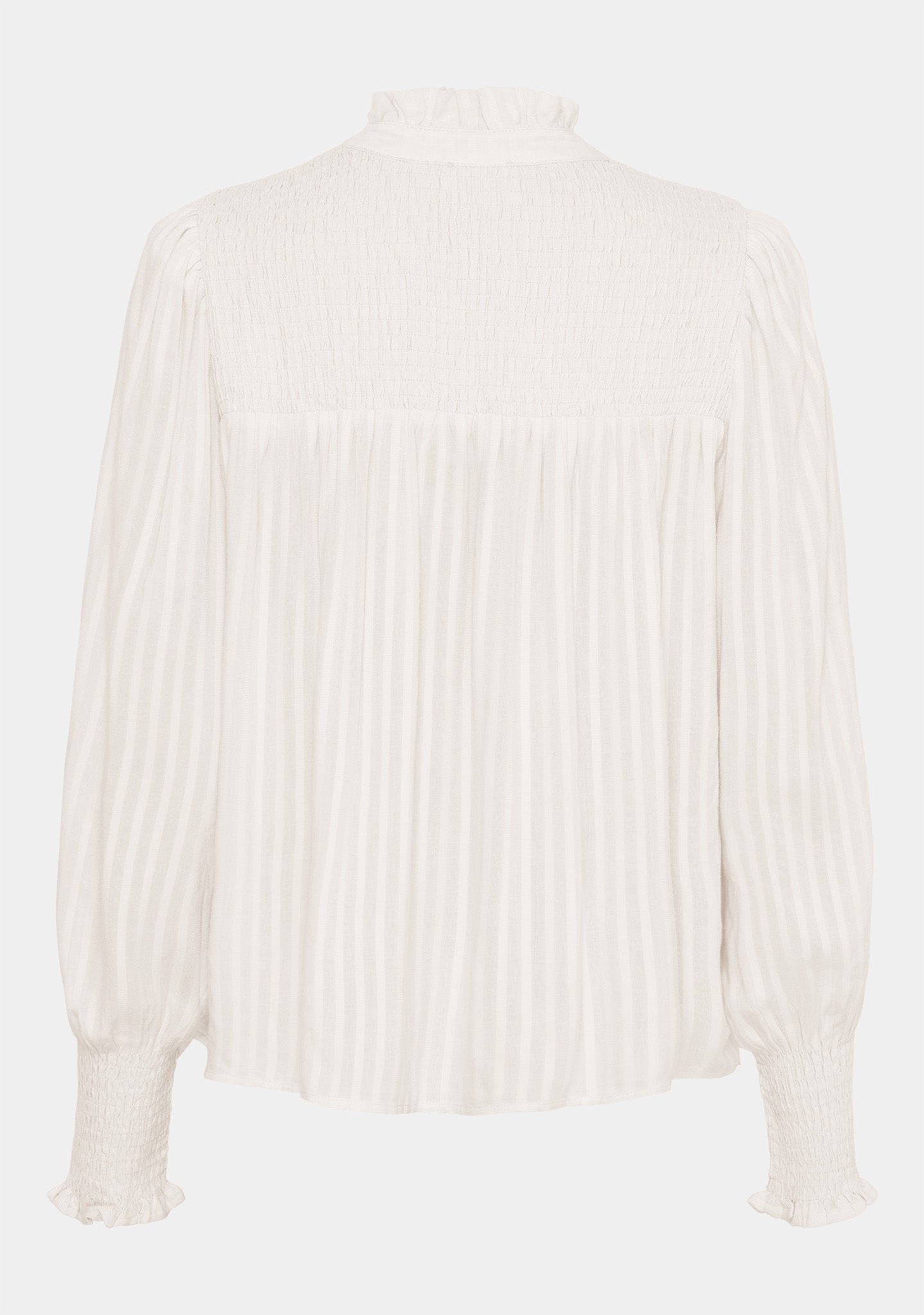 Die Lea Bluse ist eine feminine Bluse mit einem leichten und luftigen Ausdruck. Der lockere Schnitt sorgt für eine bequeme Silhouette, während der kleine Stehkragen und der V-Ausschnitt eine elegante Note hinzufügen. Das Rüschen-Detail oben bietet eine schöne Struktur, und die langen Ärmel sind mit Rüschen und einem leichten gewellten Rand versehen, der das feminine Design betont. Hergestellt aus einer weichen Viskosemischung mit leichter Struktur, die angenehm auf der Haut liegt und wunderschön am Körper fällt.