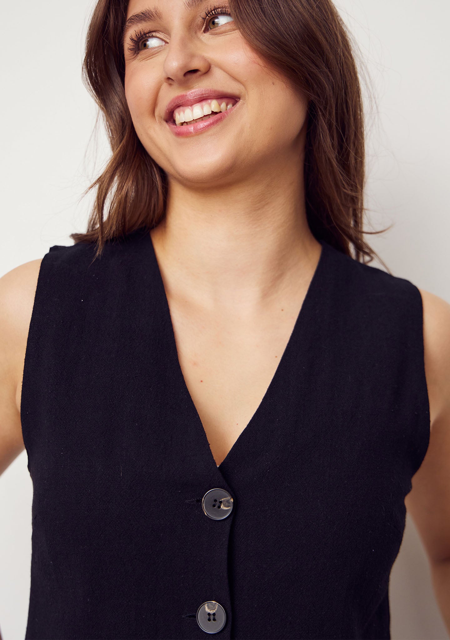 Der Pearl Waistcoat ist ein stilvolles und vielseitiges Kleidungsstück, das der Garderobe einen raffinierten und modernen Touch verleiht. Der elegante V-Ausschnitt und der figurbetonte Schnitt sorgen für einen schmeichelhaften Look, während die leichte Leinen/Viskose-Mischung ein angenehmes und atmungsaktives Tragegefühl bietet. Perfekt als Schichtungsstück oder alleine für einen minimalistischen und schicken Look.