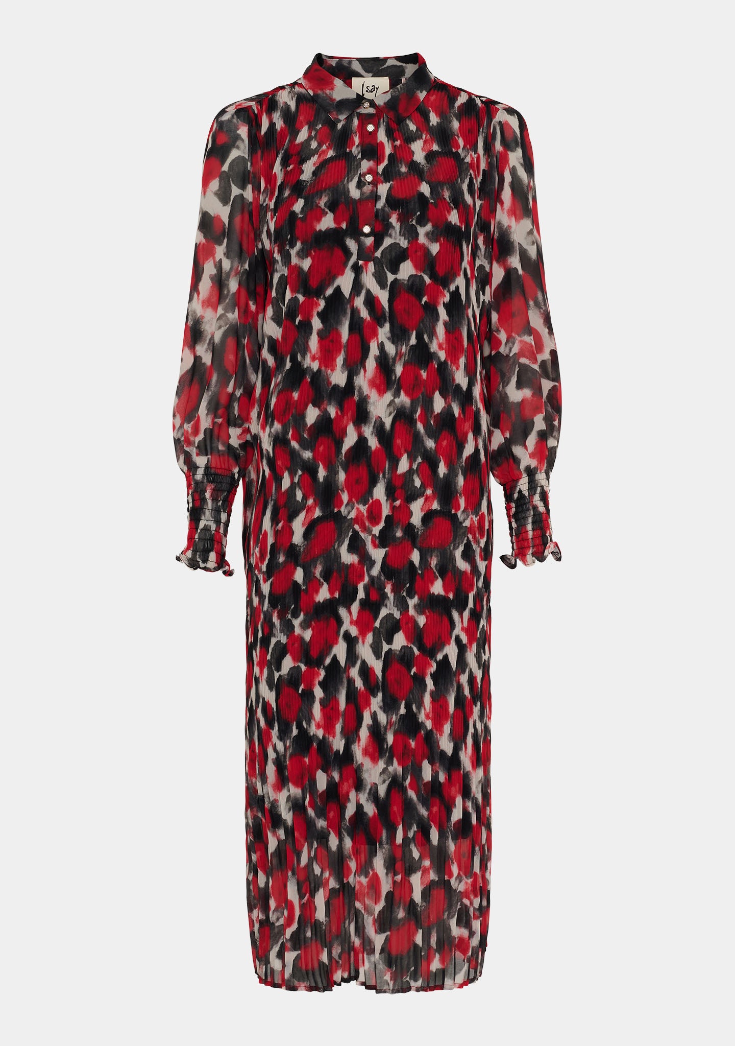 Die langen Ärmel sind mit Smock und einer zarten Rüschenkante versehen, die einen femininen Touch bietet. Das Kleid ist locker geschnitten und hat eine entspannte Passform, die Freiheit und Komfort bietet – perfekt für Tage, an denen Sie sich sowohl schick als auch entspannt fühlen möchten.