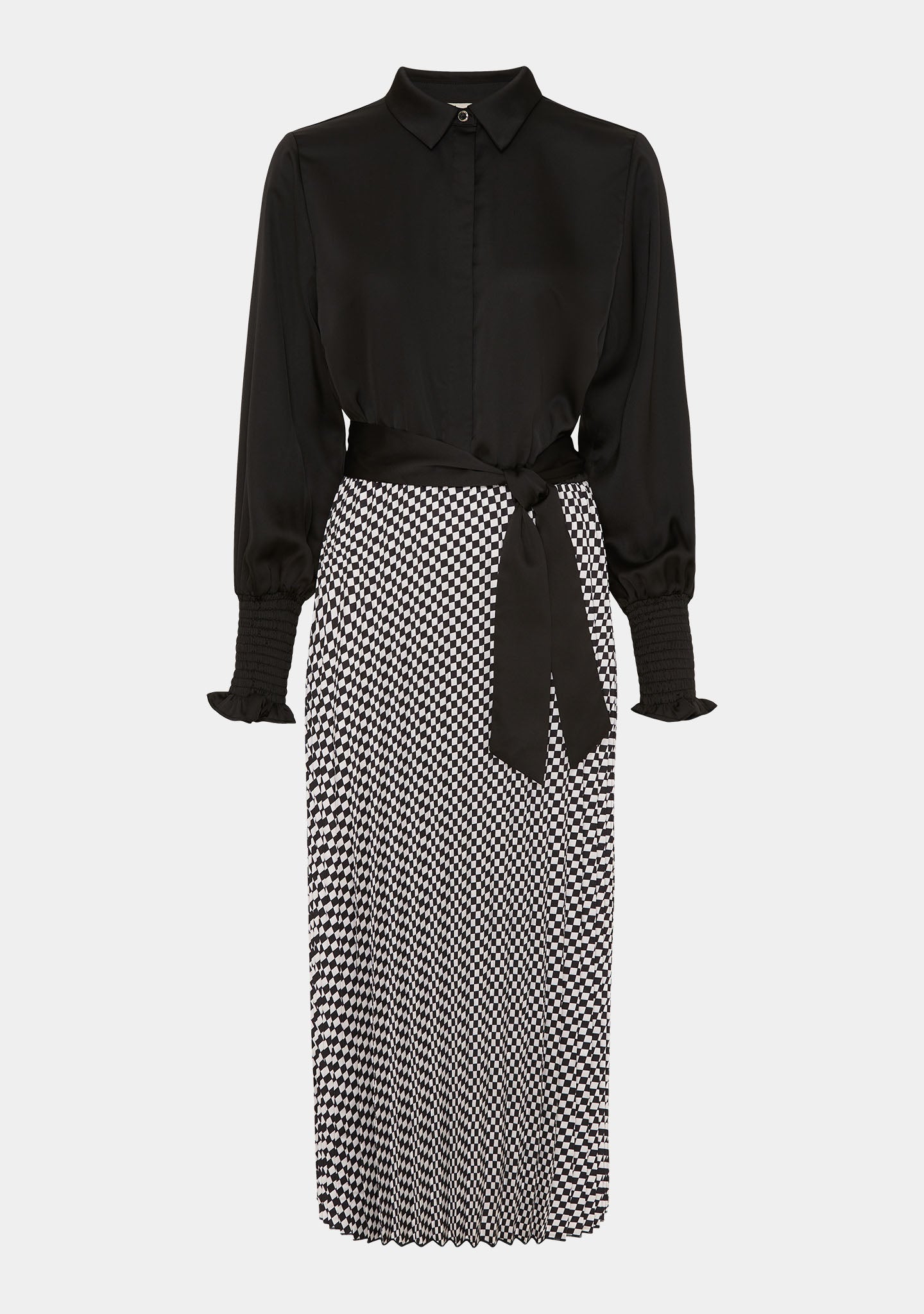 We are very excited about the design of our Beckie Dress. It's a classic dress that's combined with unique details to create personality. The dress is a two-piece ensemble, consisting of a composed look where the top has a smooth, satin-like finish, and the bottom features a pleated skirt in a classic yet lovely print. The dress has elastic at the waist, designed to accentuate your figure and fit nicely on the body. The Beckie dress also features smocked sleeves, a waist tie, and a hidden button closure as part of its unique details.
