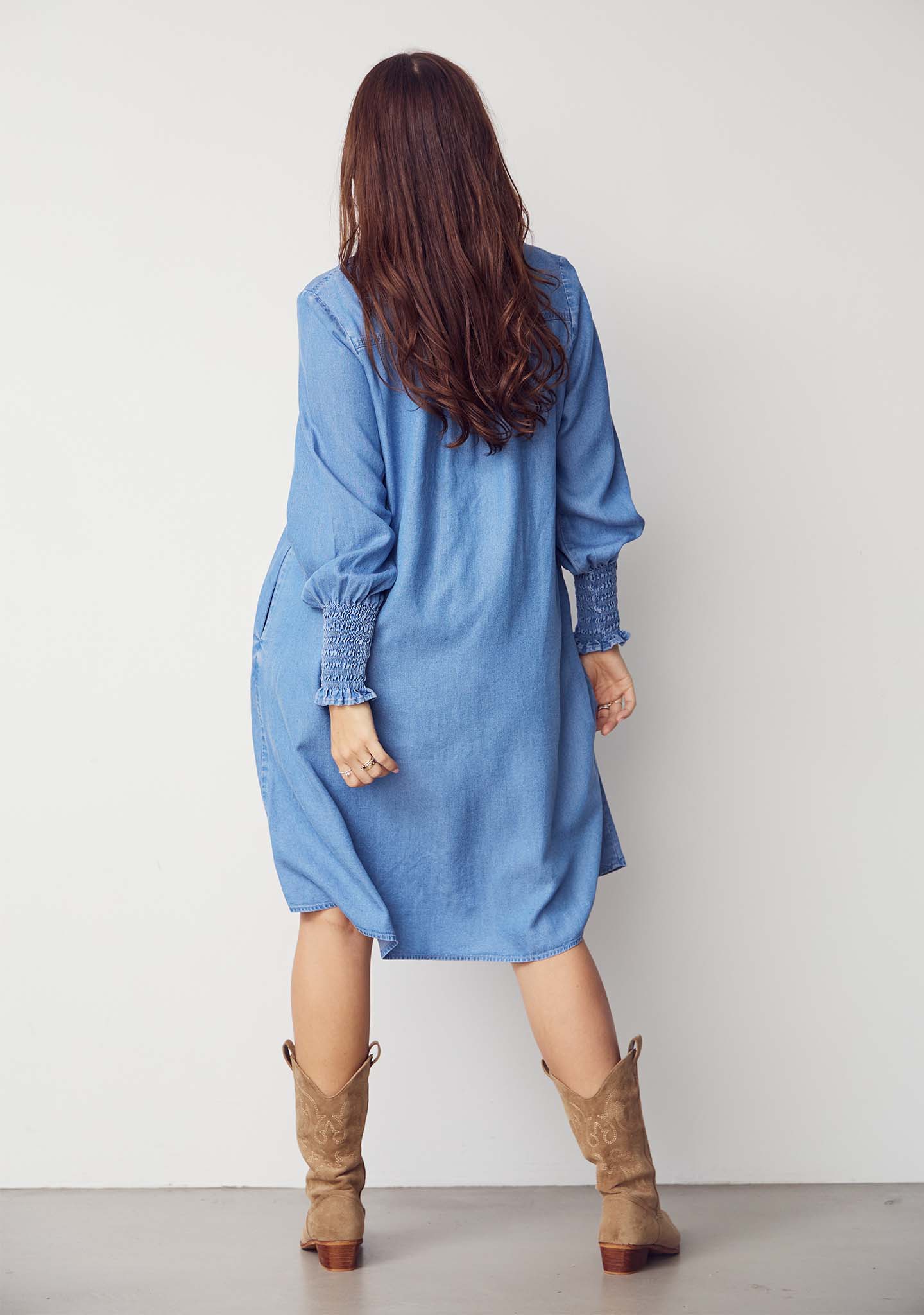 Das Ganja Dress ist ein zeitloses Hemdkleid mit femininen Details und einer bequemen lockeren Passform. Das Kleid verfügt über einen klassischen Hemdkragen und eine halbe Knopfleiste mit Knöpfen, die das schlichte Design betonen. Die Ärmel sind mit Smok und kleinen Rüschen verziert, was einen weichen und romantischen Touch verleiht. Es ist aus 100 % TENCEL™ gefertigt, einem Material, das für seinen schönen Fall, sein seidiges Gefühl und seine atmungsaktive Qualität bekannt ist und das Kleid besonders angenehm zu tragen macht.