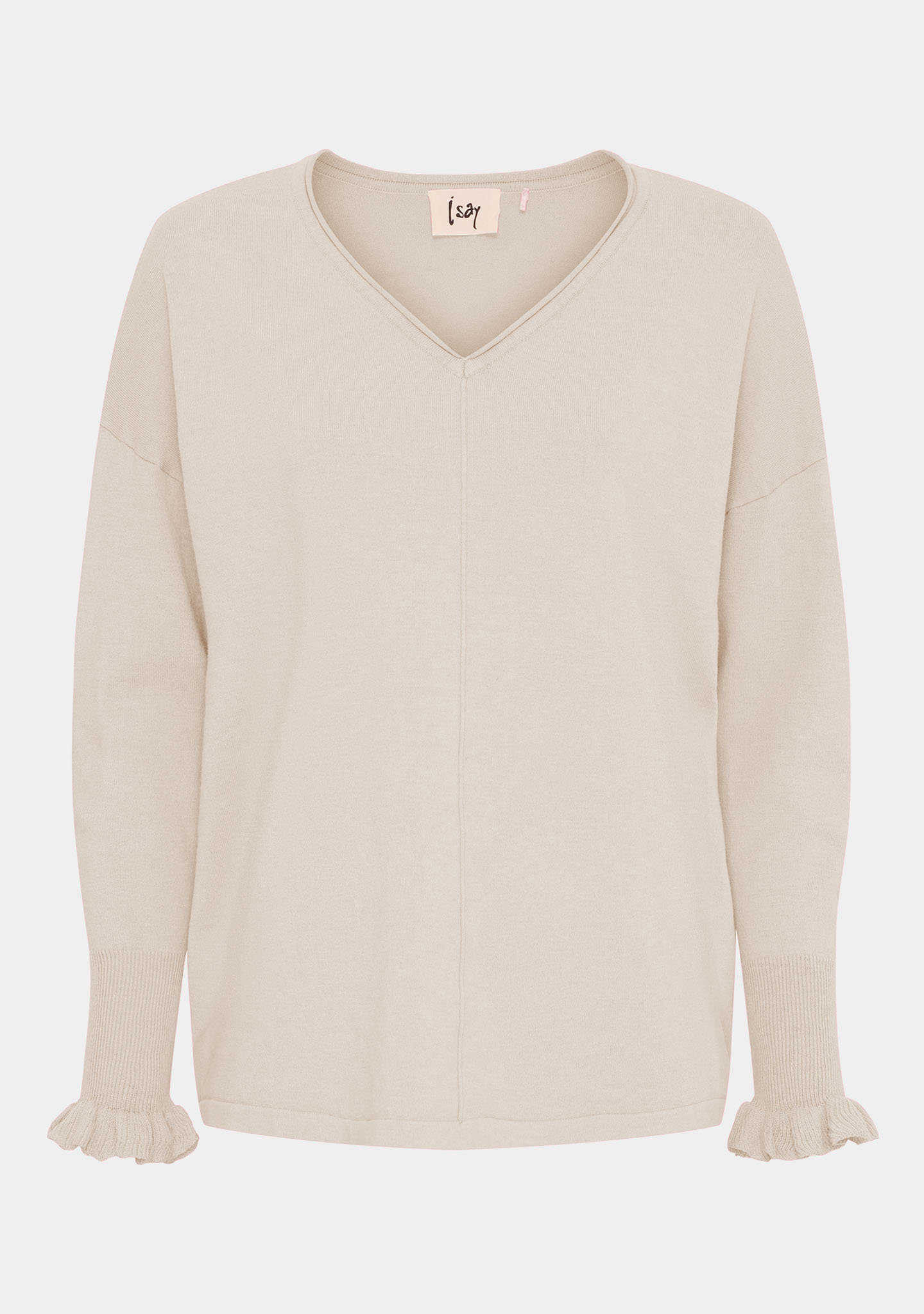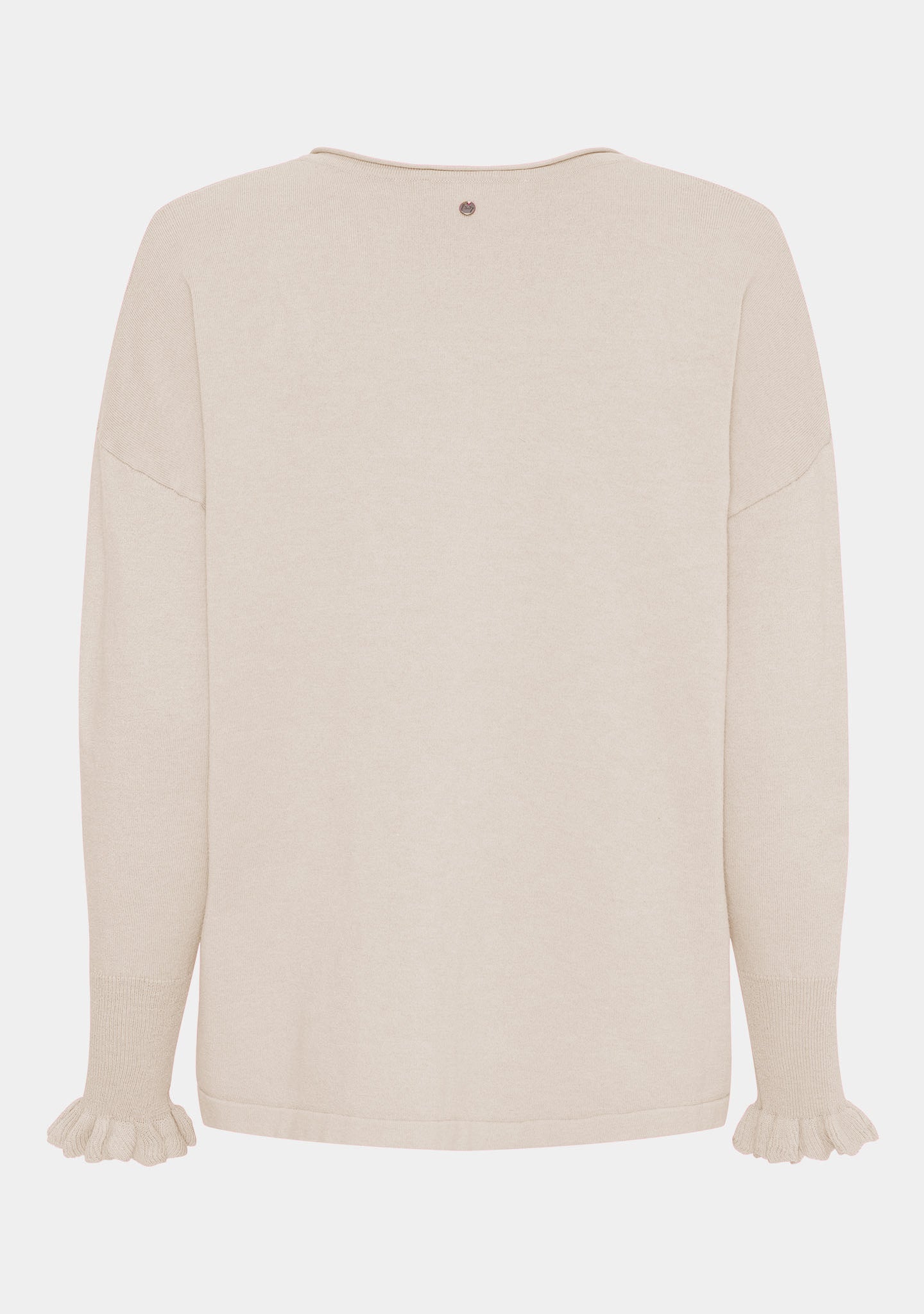 Der Frigga Smock Pullover ist ein weicher und bequemer Strick, der entspannten Komfort mit femininen Details vereint. Der einfache V-Ausschnitt hat einen fein gestrickten Rand für ein elegantes Aussehen. Der Strick hat lange Ärmel mit gesmokten Ärmelbündchen und kleinen Rüschen, was einen romantischen und leichten Ausdruck schafft. Hergestellt aus einer Baumwollmischung mit einem Hauch Elastan bietet der Strick eine bequeme Dehnung und gewährleistet eine gute Beweglichkeit.
