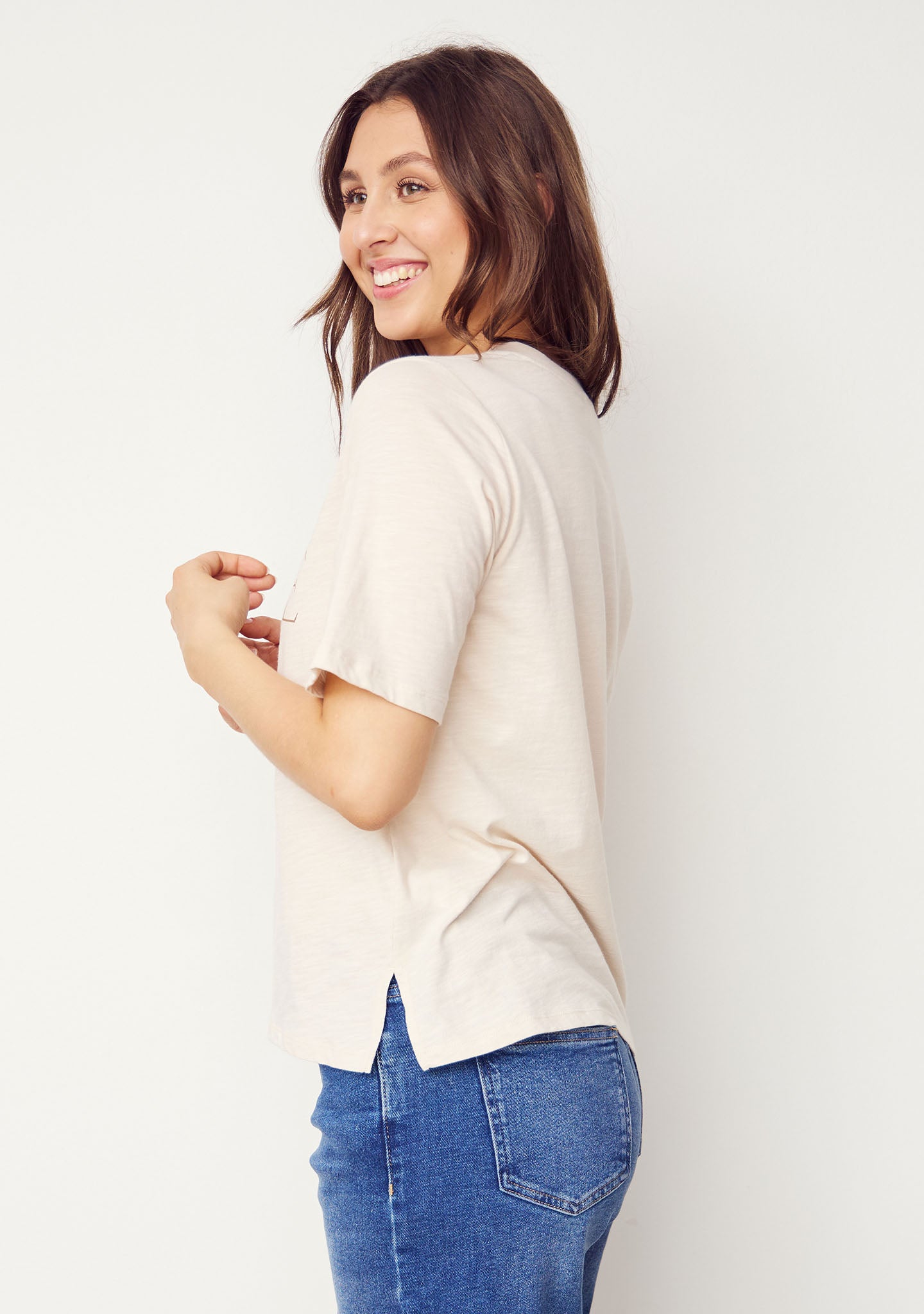 Für einen smarten Alltagslook kann das T-Shirt mit schmalen Jeans und Sandalen gestylt werden, während es zusammen mit einem leichten Blazer und einem Midi-Rock ein elegantes und modernes Outfit kreiert.