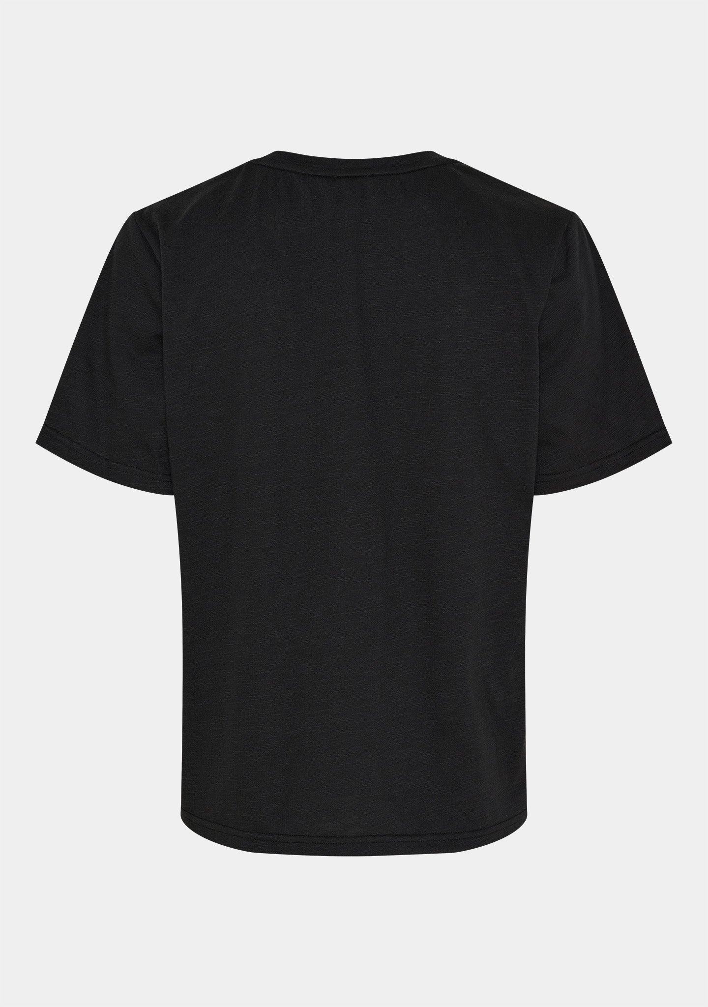 Das T-Shirt besteht aus einer weichen Baumwoll-Polyester-Mischung, die sich angenehm auf der Haut anfühlt und auch nach dem Waschen die Form behält. Die leicht strukturierte Qualität verleiht zusätzliche Tiefe, und die Passform ist entspannt – perfekt kombinierbar mit Jeans, Shorts oder unter einem Blazer für einen lässigeren Look.
